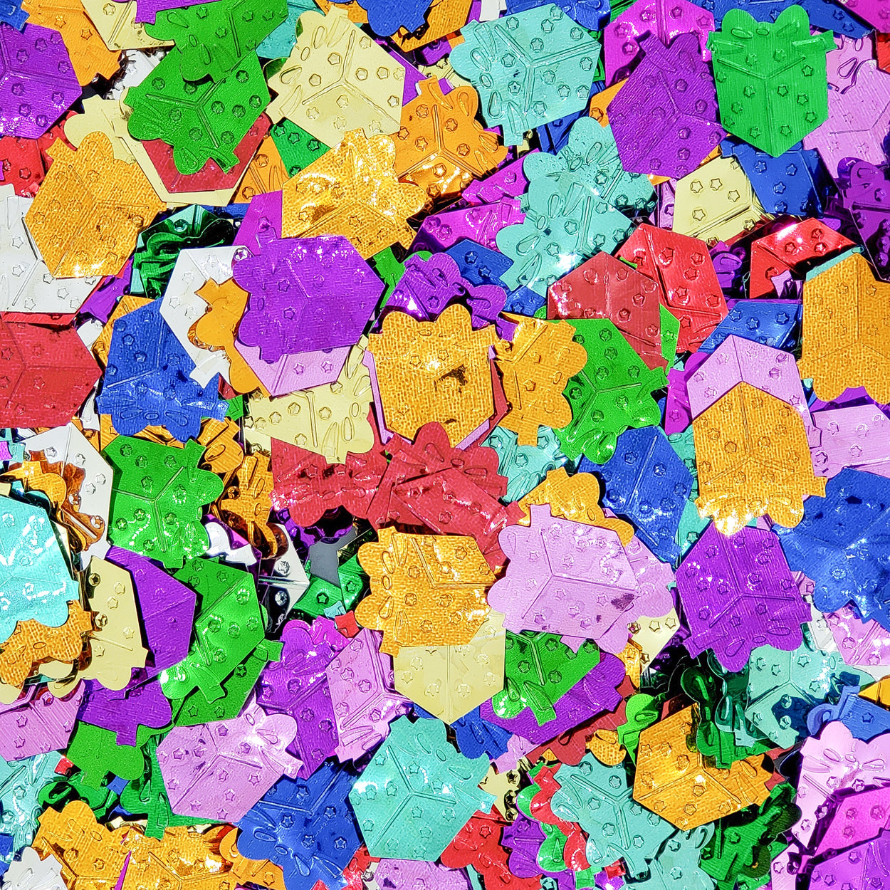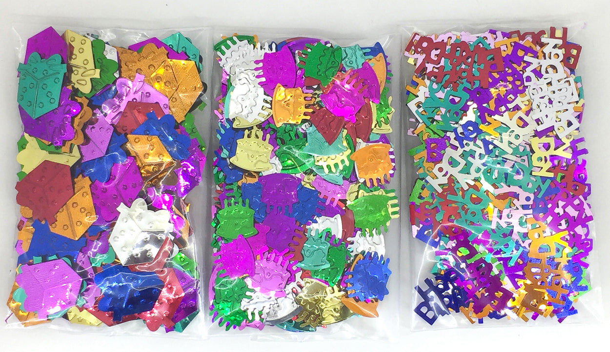 SHAPES INCLUDE: Gift Box, Birthday Cakes, and Happy Birthday ENOUGH FOR: 3 to 6 Party Tables or 9 to 21 Invites. SHAPE SIZE: Varies; WEIGHT: 1.5 oz. (42 grams)